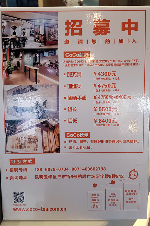 The wages were not very high, an “attendant” is at the bottom at CNY 4300 (AUD 916). Next on the list is I think “experienced drink member”, not sure what the third one is, the fourth one is “team leader” and the last is “store manager” at CNY 6400 (AUD 1364). So painfully low…